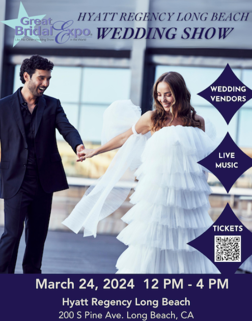 Great Bridal Expo is hosting a Wedding Show at the Hyatt Regency Long Beach on March 24, from 12PM to 4PM. This free event will feature wedding vendors, including thousands of products and services for your wedding, and live music.